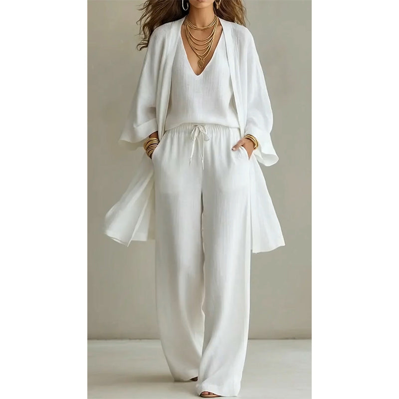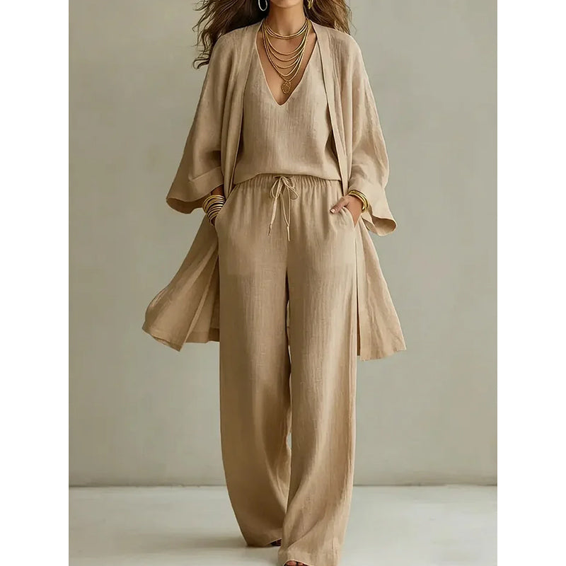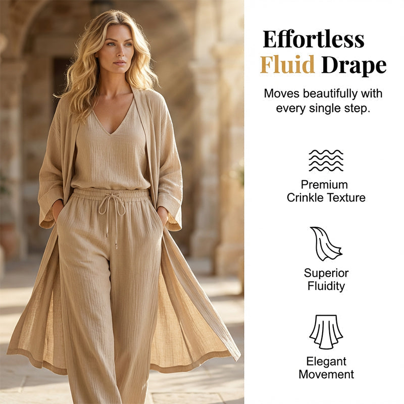 MÜHELOSE, FLÜSSIGE FALLSCHWUNG – Erleben Sie unvergleichliche Eleganz mit unserem hochwertigen, fließenden Dreiteiler. Die weit geschnittene Hose und die lässige Strickjacke sorgen für einen anmutigen Fall, der sich wunderschön bewegt und so ganztägigen Tragekomfort und mühelos eleganten Stil garantiert.