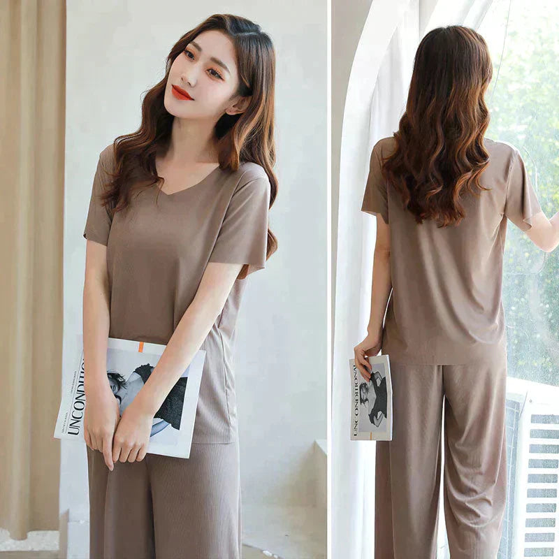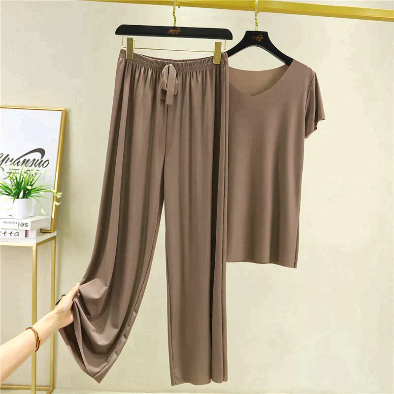 Camiseta de manga corta suave y cómoda de seda helada, pantalones sueltos de pierna ancha,conjunto de dos piezas